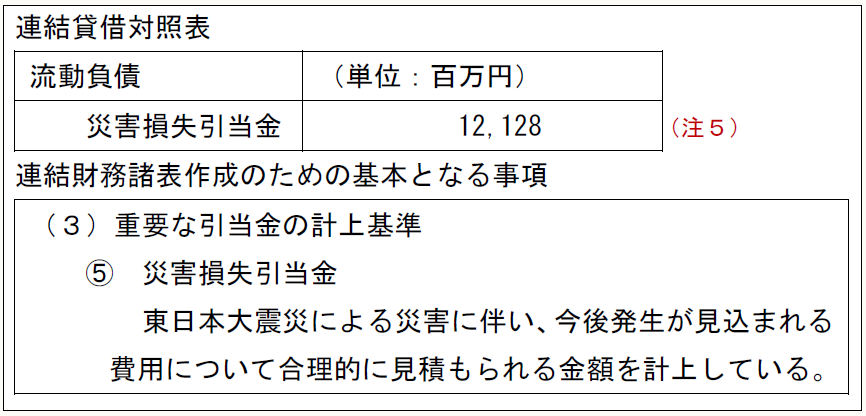 連結貸借対照表 流動負債	(単位:百万円)   災害損失引当金	     12,128 連結財務諸表作成のための基本となる事項 (3)重要な引当金の計上基準   ⑤ 災害損失引当金     東日本大震災による災害に伴い、今後発生が見込まれる費用について合理的に見積もられる金額を計上している。  (注5)