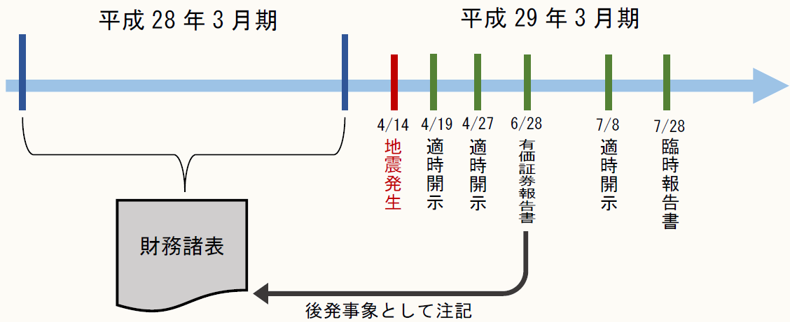 平成28年熊本地震は4月14日に発生しており、3月決算の法人にとっては、適時開示と臨時報告書の提出、加えて通常の有価証券報告書の提出も重なることとなった。