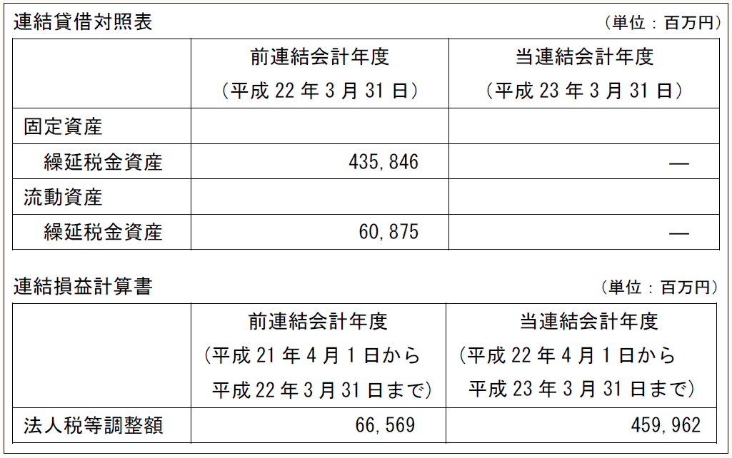 連結貸借対照表                      (単位:百万円) 	前連結会計年度 (平成22年3月31日)	当連結会計年度 (平成23年3月31日) 固定資産		  繰延税金資産	435,846 	―  流動資産		  繰延税金資産	60,875 	―   連結損益計算書                      (単位:百万円) 	前連結会計年度 (平成21年4月1日から  平成22年3月31日まで)	当連結会計年度 (平成22年4月1日から  平成23年3月31日まで) 法人税等調整額	66,569 	459,962   (注6)