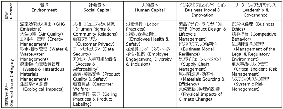 SASBスタンダードでは、企業のサステナビリティを分析する視点として、以下のとおり、5つの局面(Dimension)と、それに関係する26の課題カテゴリー(General Issue Category)を設定している。