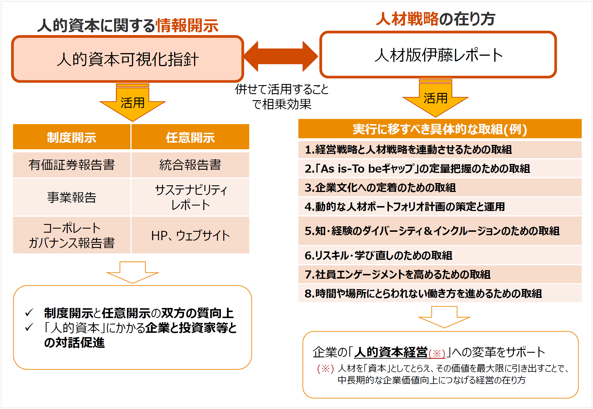 「人的資本の可視化」においては、企業が経営戦略に紐づいた「人材戦略」を策定していることが前提となる。企業が効果的に「人材戦略」の策定とそれを実践するための指針として、「人材版伊藤レポート(2020年9月)」及び「人材版伊藤レポート2.0(2022年5月)」が参考となる。「人的資本の可視化」への期待が高まり、人的資本の開示要請が国内外で規制化され導入されつつある。