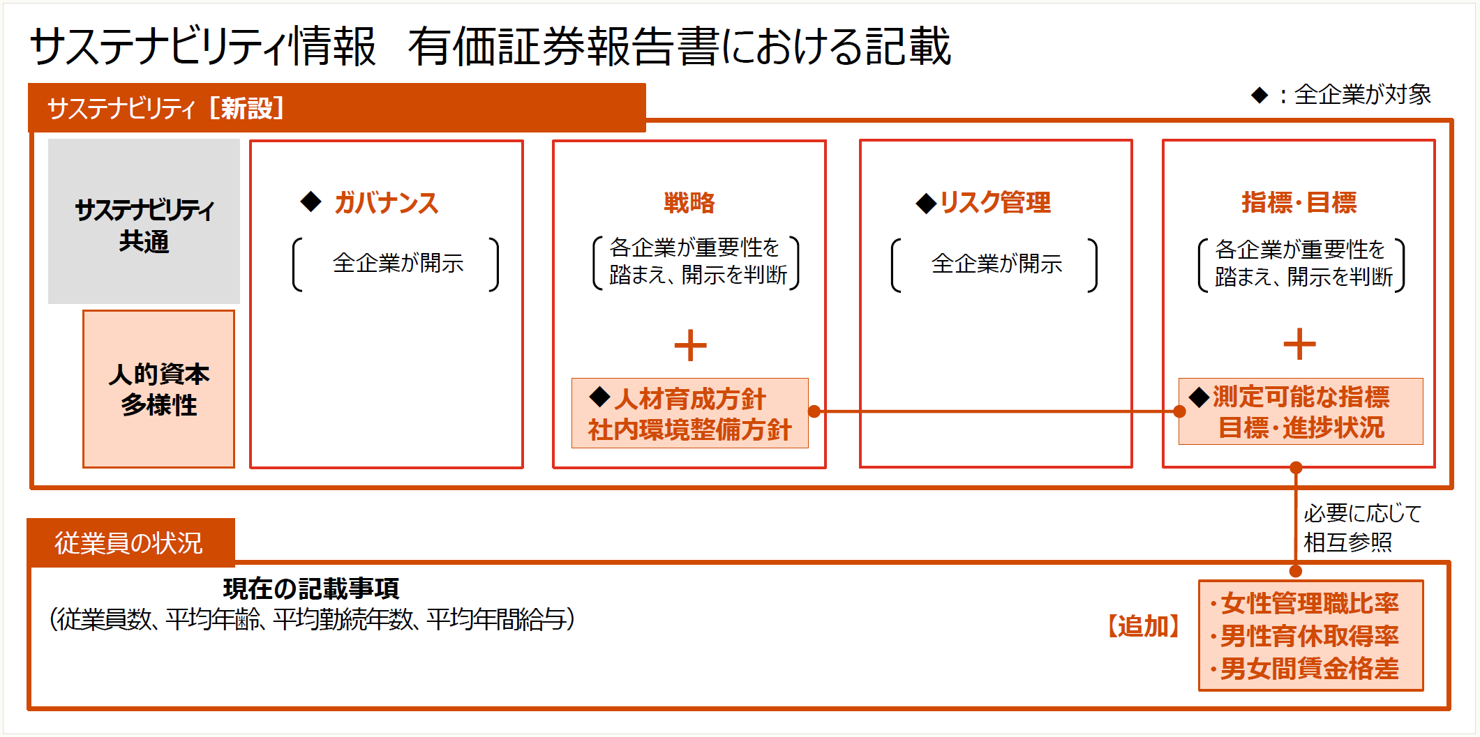有価証券報告書の「従業員の状況」の中で、個社別の追加開示が求められた上記3つの人的指標については、「女性活躍推進法」等の規定による公表をしない場合は、有価証券報告書における記載を省略することができるとされているものの、連結ベースでの開示に努めることが推奨されている。