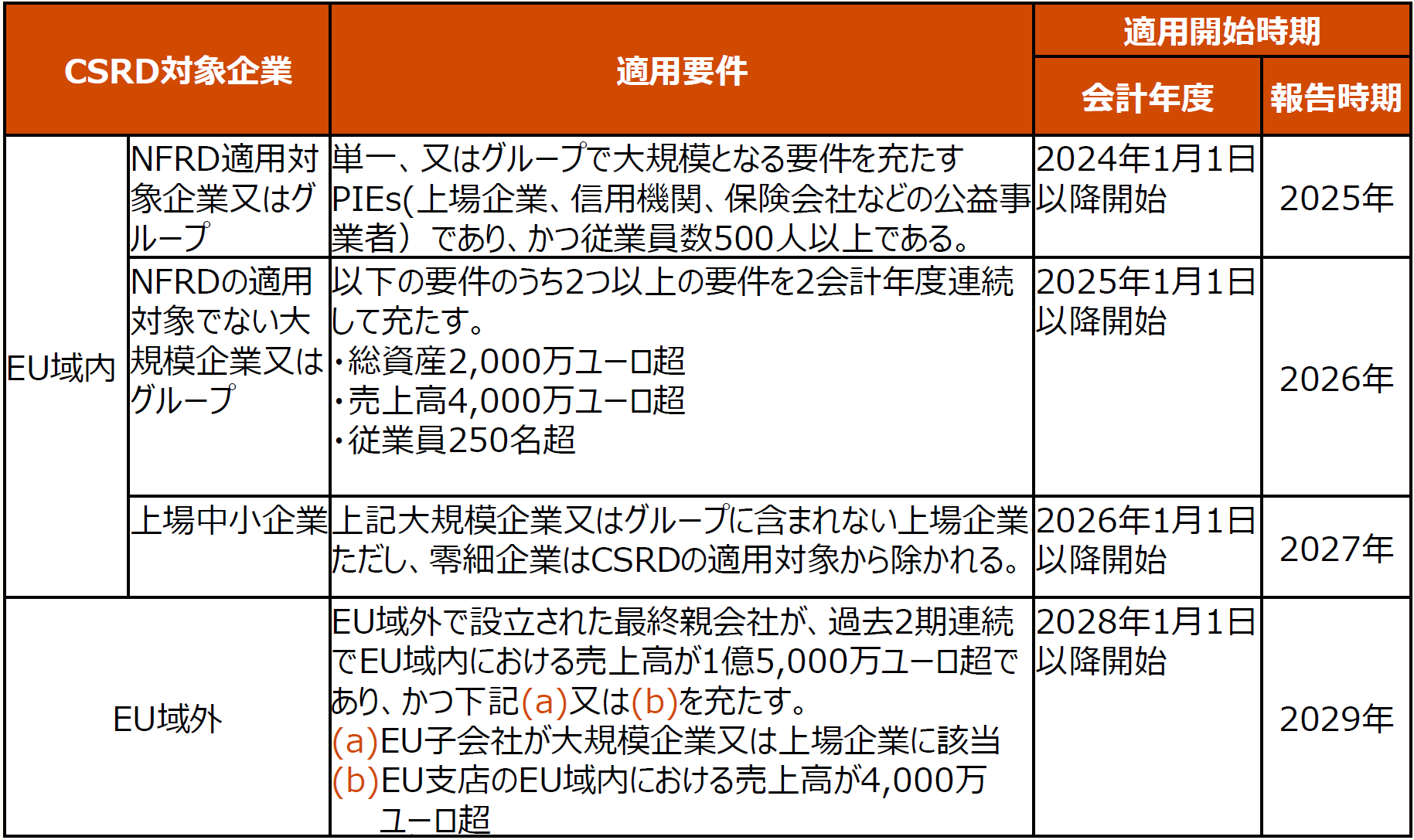 CSRDは、欧州議会及び欧州理事会による採択後、2023年1月5日に発効し、EU加盟国は、発効から18ヶ月以内に国内で法制化することを義務付けられている。