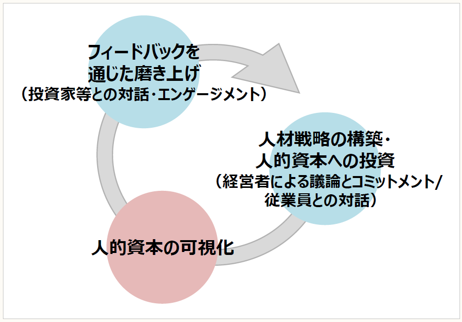 企業が、自社の人的資本への投資や人材戦略の在り方を投資家・従業員をはじめとするステークホルダーに対して広くわかりやすく説明することで、相互理解が深まり、フィードバックが積極的に行われることにより資本市場における好循環につながることが期待される。そのため、「人的資本の可視化」が不可欠であると考えられている。