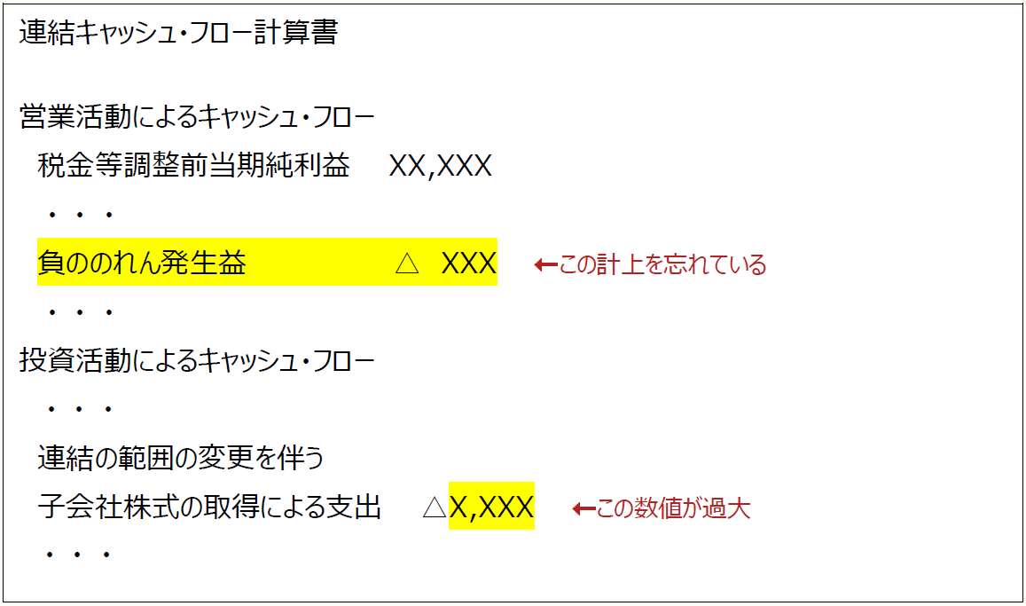 連結キャッシュ・フロー計算書の営業活動によるキャッシュ・フローにおいて、「負ののれん発生益」をマイナス計上し忘れたという決算短信の訂正事例があります。