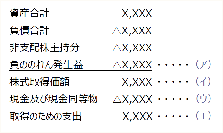 訂正事例では、(エ)の額に「負ののれん発生益」(ア)を加えてしまっていたようです。