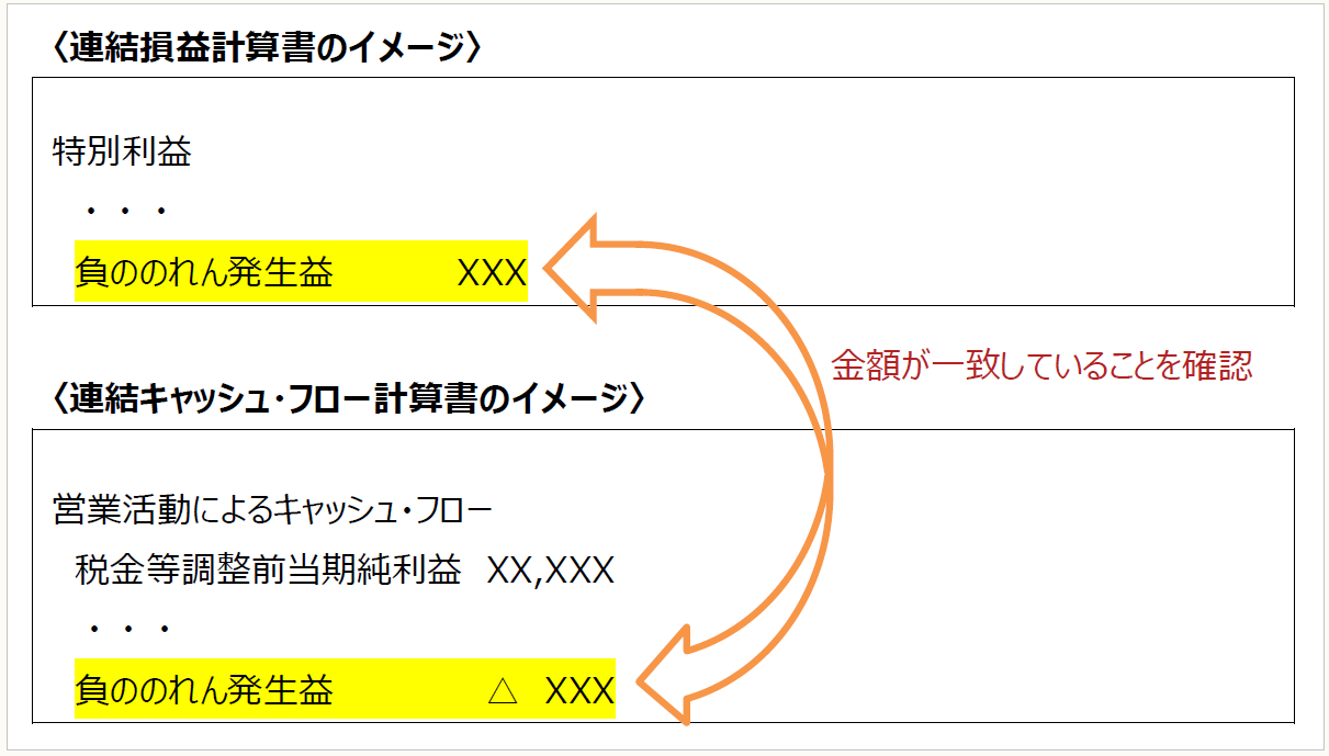 「負ののれん発生益」が連結損益計算書に計上されている場合は、連結キャッシュ・フロー計算書の営業活動によるキャッシュ・フローに「負ののれん発生益」が計上されており、金額が一致している(連結キャッシュ・フロー計算書では△が付されます)ことを確かめます。