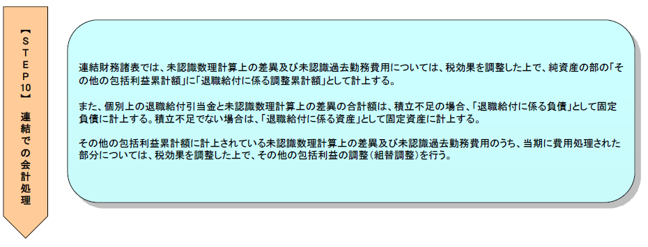 また、個別上の退職給付引当金と未認識数理計算上の差異の合計額は、積立不足の場合、「退職給付に係る負債」として固定負債に計上する。積立不足でない場合は、「退職給付に係る資産」として固定資産に計上する(基準27)。
