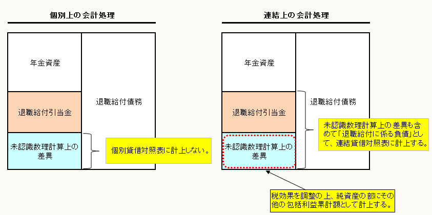 個別財務諸表では、未認識数理計算上の差異及び未認識過去勤務費用は、貸借対照表に計上されないが、連結財務諸表では、未認識数理計算上の差異及び未認識過去勤務費用については、税効果を調整した上で、純資産の部の「その他の包括利益累計額」に「退職給付に係る調整累計額」として計上する(適用指針33(2))。