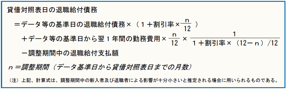 この方法では、データ等の基準日のデータ等を用いて、貸借対照表日時点の退職給付債務を算定した上で、調整期間の新入者及び退職者の異動データを用いて退職給付債務を調整する。