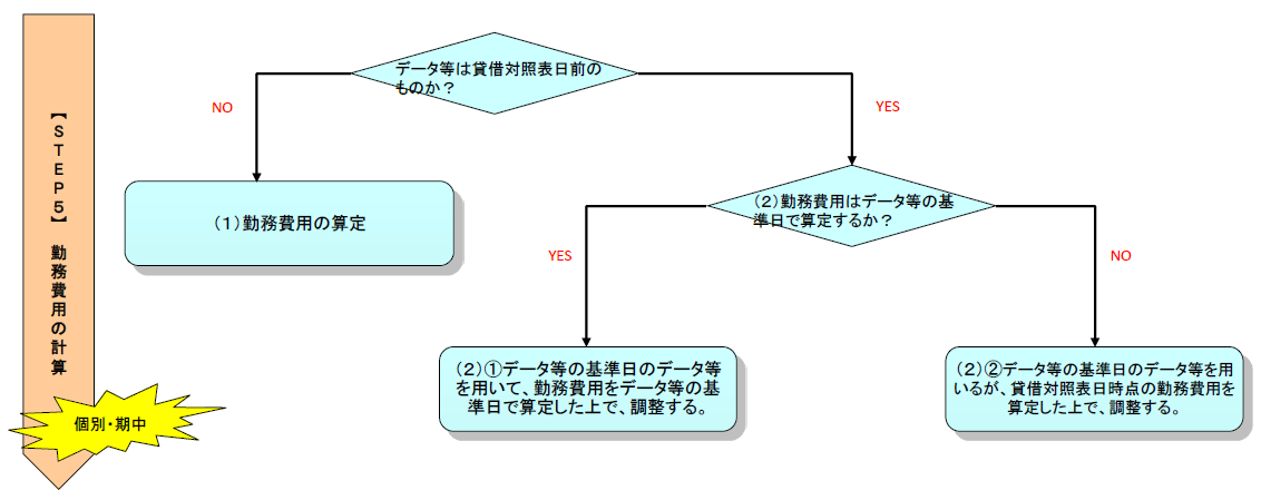 ここで、勤務費用も退職給付債務と同様に、データ等を貸借対照表日のものを用いているか否かで、勤務費用の算定過程が異なる。そのため、データ等が貸借対照表日現在のものの場合は、(1)を検討し、貸借対照表日前の場合は、(2)を検討する。