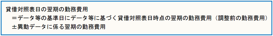 データ等の基準日のデータ等を用いて、貸借対照表日時点の勤務費用を算定した上で、調整期間の新入者及び退職者の異動データを用いて勤務費用を調整し、貸借対照表日における勤務費用を算定する。当該算定は、前期末に行い、当期に退職給付費用として計上する。