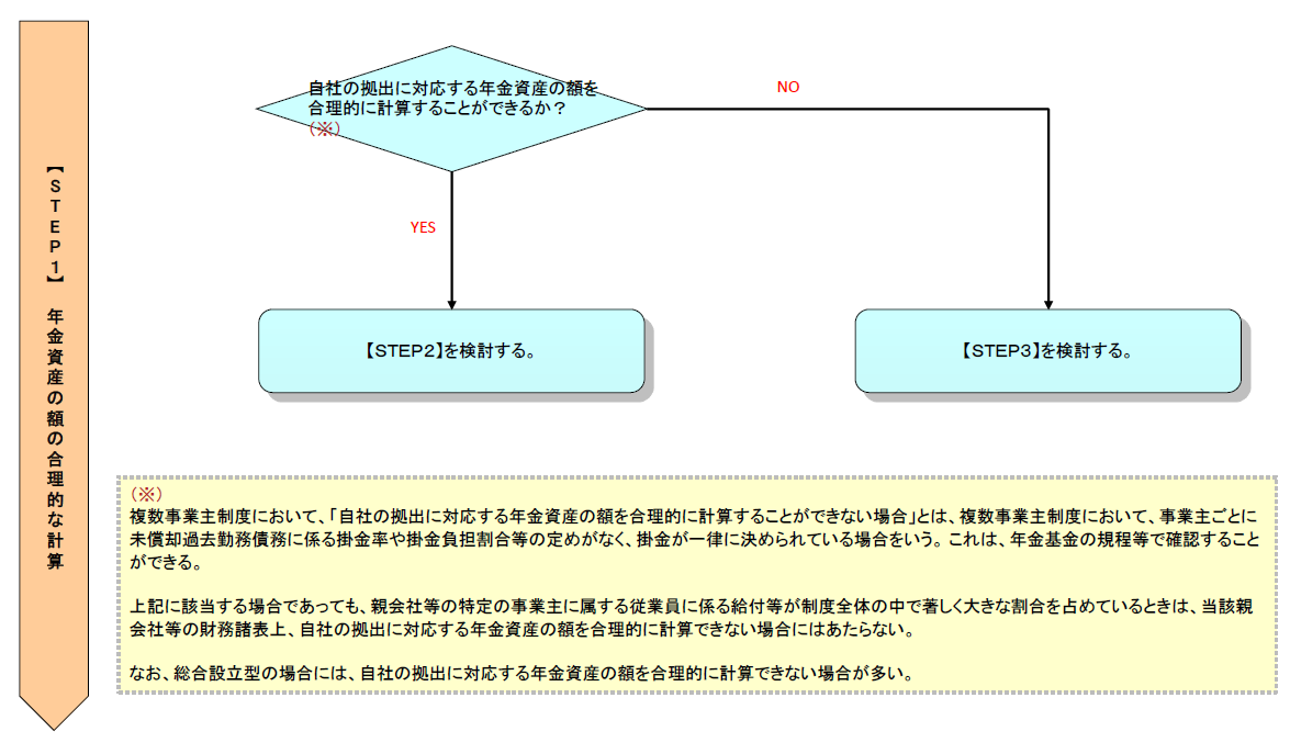 上記の検討の結果、自社の拠出に対応する年金資産の額を合理的に計算することができる場合、【STEP2】を検討する。できない場合は、【STEP3】を検討する。