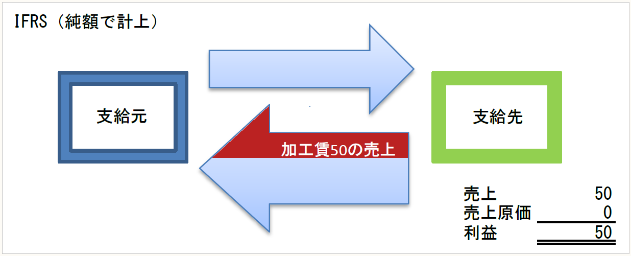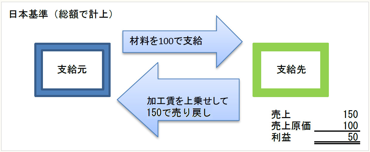 このとき支給先でどのような会計処理が行われているかというと、これまでの日本基準では厳密な決まりはなく、複数の考え方があるのですが、その1つとして、上の図表に示したように、売上と売上原価を総額で表示する処理が実務で行われています。