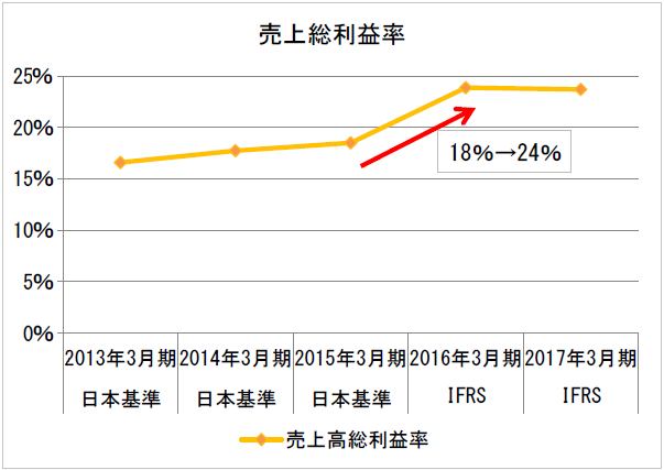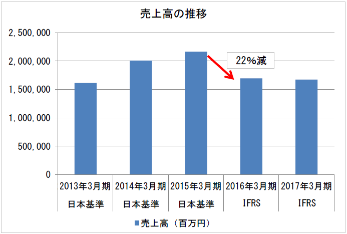 上のグラフの場合、売上が急減した2016年3月期以降、それまでの日本基準からIFRSに会計ルールが変更されています。グラフで見られる売上の急減は、他でもないそのせいでした。