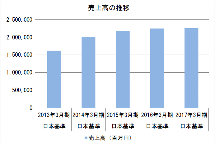 つまり、上のグラフは、2013年3月期から2017年3月期まですべて、日本基準の売上数値を並べたものというわけです。