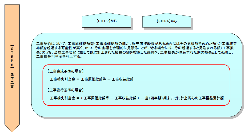 工事契約について、工事原価総額等(工事原価総額のほか、販売直接経費がある場合にはその見積額を含めた額)が工事収益総額を超過する可能性が高く、かつ、その金額を合理的に見積ることができる場合には、その超過すると見込まれる額(以下「工事損失」という)のうち、当該工事契約に関して既に計上された損益の額を控除した残額を、工事損失が見込まれた期の損失として処理し、工事損失引当金を計上する(基準19)。