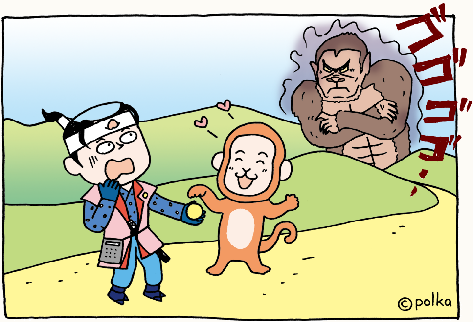 実際の『桃太郎』には、ボス猿がいるという話はありませんが、ここではサルがボス猿の指示を受けて桃太郎のところにやって来たことにしてみました。