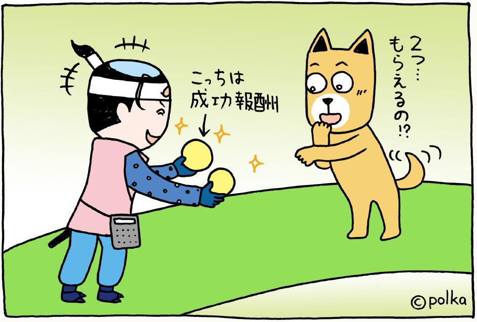 今回は「桃太郎がイヌに成功報酬を出す」というお話に変えてみましょう。