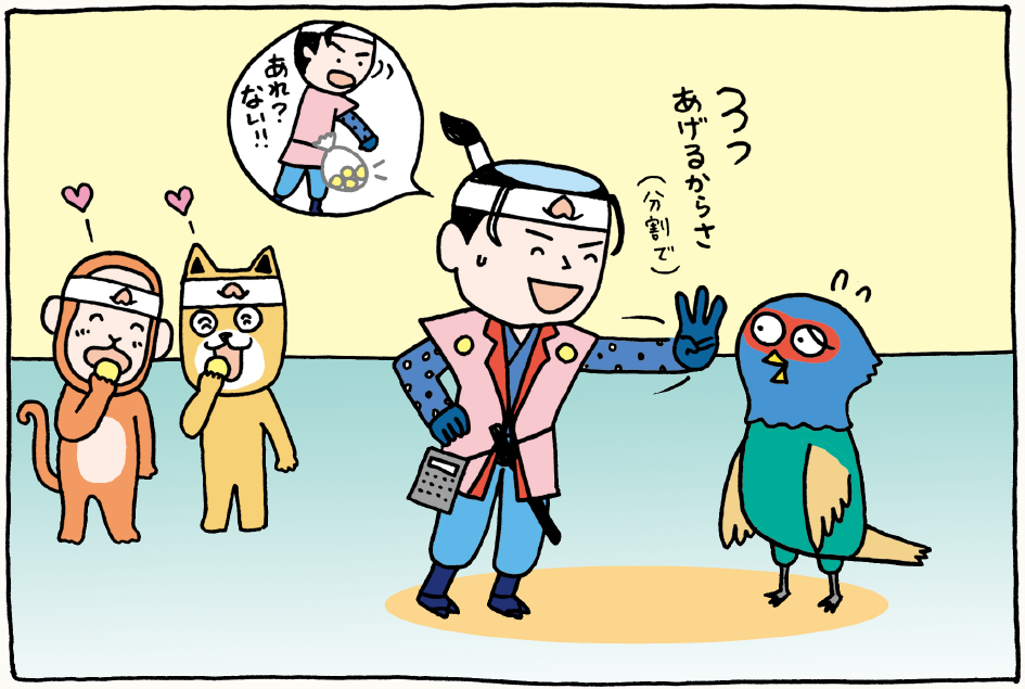 「ごめん、ごめん、キジさん。鬼退治から帰ってきたら、きびだんごを3つあげるから、勘弁してよ。ただし、一度に3つは無理だから、3回に分けてあげることになるけど。」