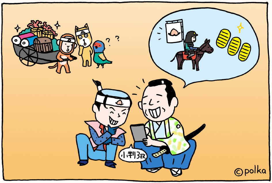 桃太郎は、お殿様から小判3枚をもらい、桃印を使わせてあげることにしました。