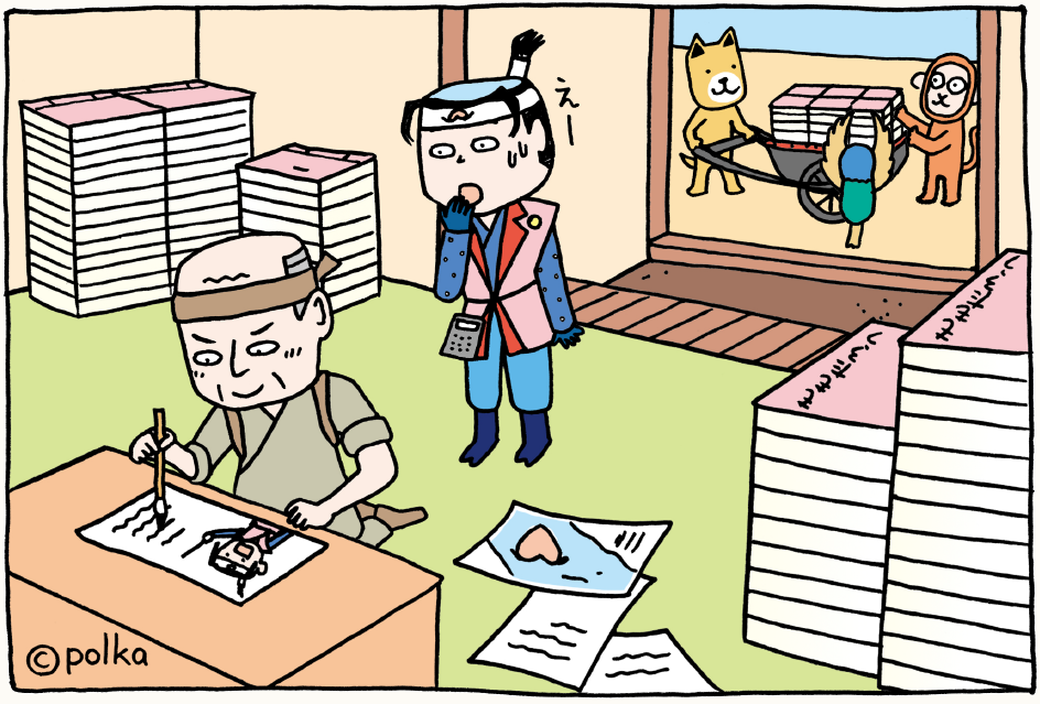 「見てのとおり。本じゃよ。こないだの鬼退治のことを絵本にして売るのさ。」