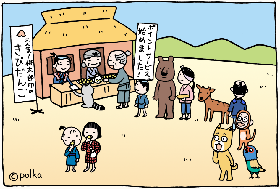 おばあさんは、きびだんごを買ってくれたお客さんに桃印のスタンプを押してあげます。お客さんが、次回以降の買い物時に、それをきびだんごの代金に充当できるのです。