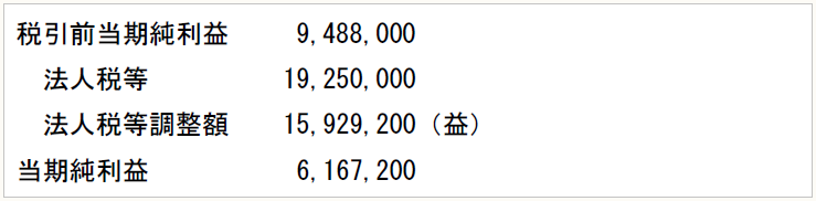 これらの一時差異を多額に含む極端な本設例では、税効果会計を適用しない場合、会計上の税引前当期純利益が黒字であるにもかかわらず、法人税等を差し引いた税引後当期純利益がマイナスになっています(会計上の税引前当期純利益9,488,000円、法人税等19,250,000円、税引後当期純利益△9,762,000円)。
