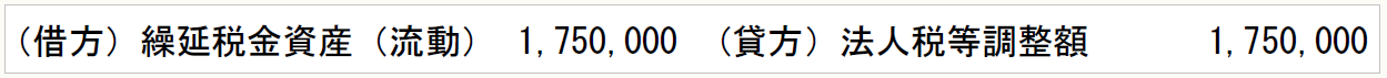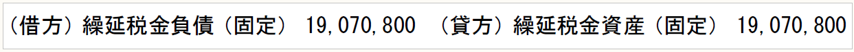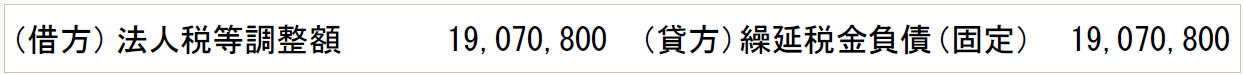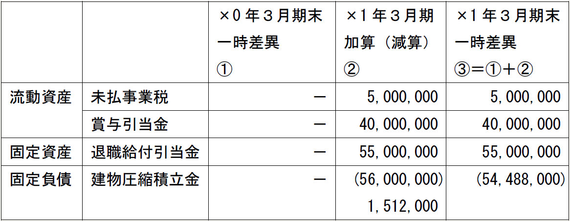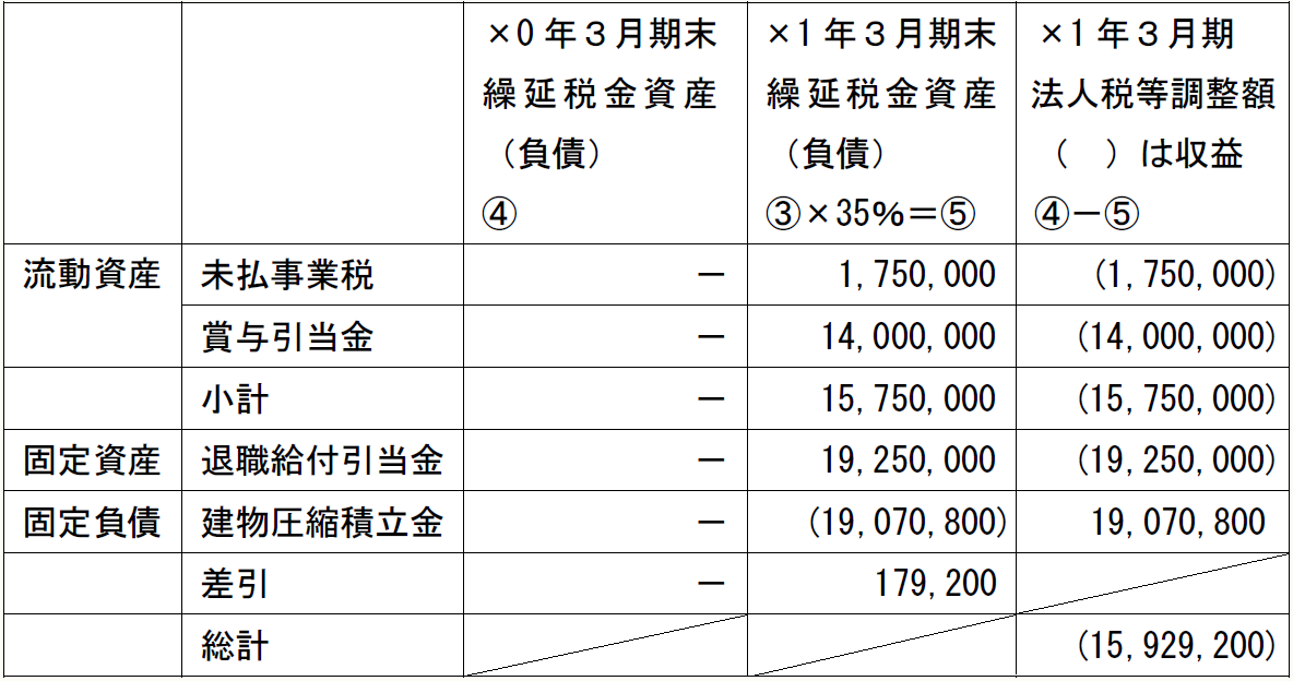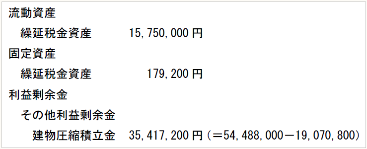 この設例では、未払事業税、賞与引当金、退職給付引当金に将来減算一時差異が生じており、未払事業税に係る当期末一時差異5,000,000円に実効税率35%を乗じた1,750,000円を繰延税金資産に計上(相手勘定は法人税等調整額)し、賞与引当金、退職給付引当金についても同様に繰延税金資産を計上します。建物圧縮積立金には将来加算一時差異が生じており、その当期末一時差異54,488,000円に実効税率35%を乗じた19,070,800円を繰延税金負債に計上(相手勘定は法人税等調整額)します。