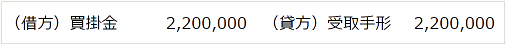 当社の仕入先乙社に対する買掛金2,200,000円を(2)の手形債権と相殺することになるので、仕訳は下記のとおり。