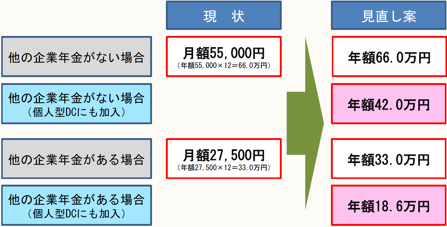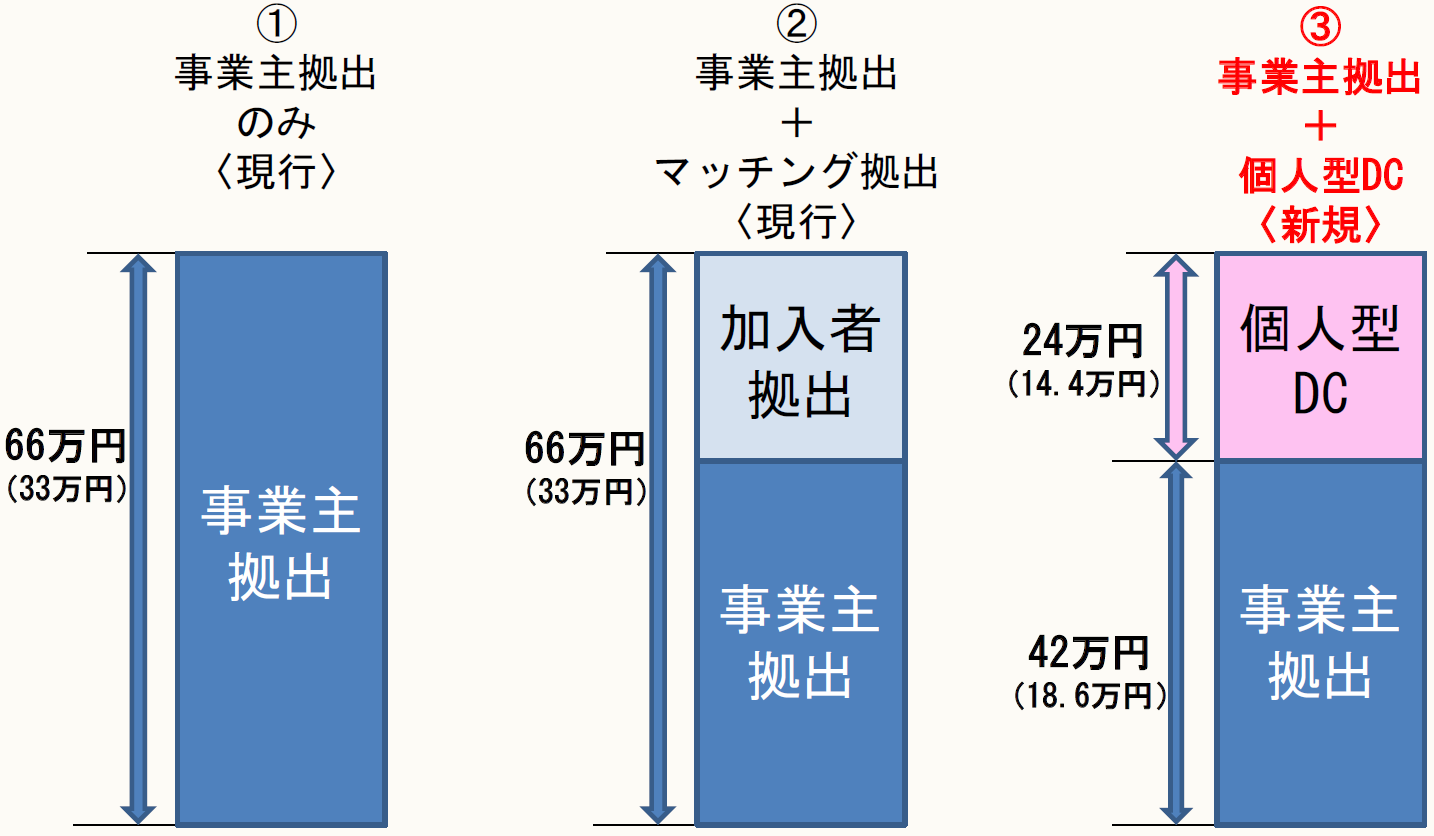 ※ 他の企業年金がない場合で、個人型DCに加入しない場合には、マッチング拠出が可能で、合算して新年額限度額となる。ただし、マッチング拠出が企業拠出の範囲内の制限は外れていない。