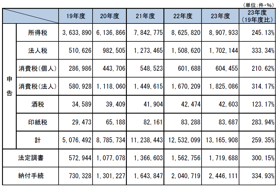 上表のように、e-Taxの利用状況は急激に増加しており、税理士が行う申告のなかで大多数を占めるであろう法人税のe-Taxによる申告件数に至っては、23年度は19年度の約3.3倍まで増加している。