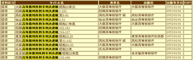 ただし、上記検索結果画面を見て分かる通り、福岡高裁・大阪高裁の分は昭和26年より所蔵されているが、東京高裁の分は昭和28年分からしか所蔵されていない。