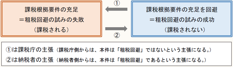 したがって、租税回避の試みを行う納税者側としては、「課税根拠要件の充足はしていない」という主張をすることで租税負担の減少を図ろうとするであろう。すなわち、本件は「租税回避」であるという主張をすることになる。