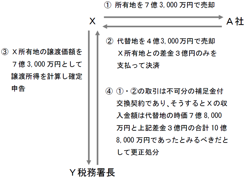 しかし、Y税務署長は、上記①~③は不可分一体の補足金付交換契約だとした上、売買でなく交換であれば、Xの収入金額は、代替地の時価に相当する金額と上記相殺差金の合計額となるから、譲渡所得の金額に誤りがあるとして、Xに対し更正処分を行った。