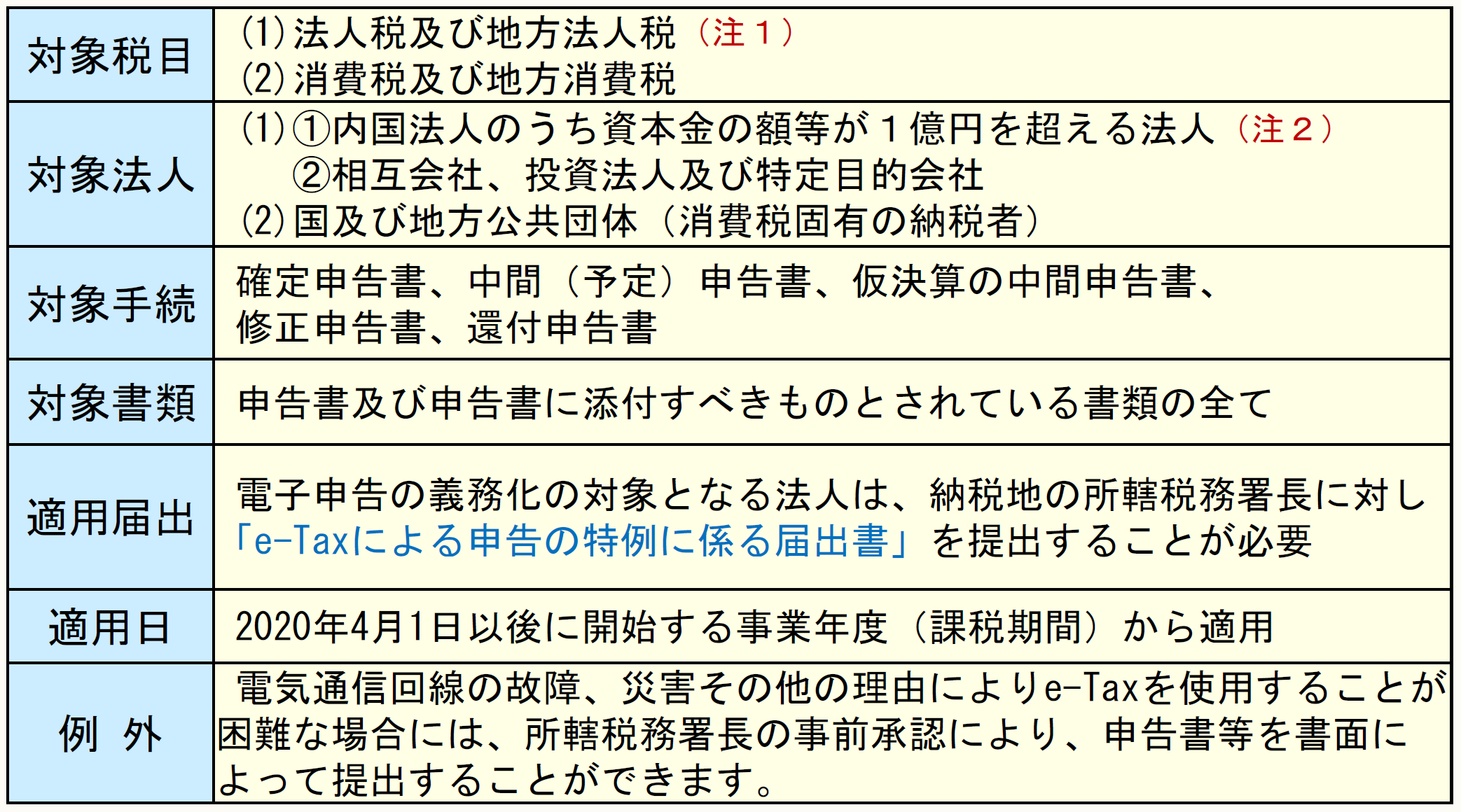電子申告の義務化の対象となる税目、法人の範囲、手続等は、以下のとおりとなります。