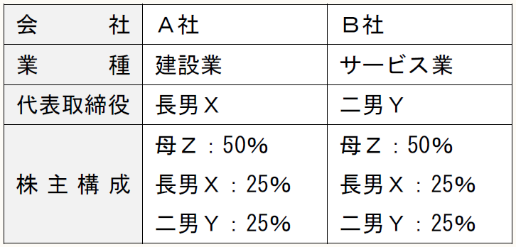私たちは、建設業を営むA社を経営する長男Xと、サービス業を営むB社を経営する二男Yの兄弟です。A社とB社は、いずれも私たち兄弟の父(故人)が創業した会社で、現在はXがA社の代表取締役を、YがB社の代表取締役を務めています。