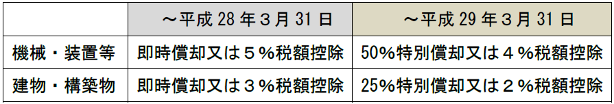 「中小企業等投資促進税制」(措法42の6)を平成29年3月31日まで延長した上で、産業競争力強化法の施行日から平成29年3月31日までに生産性向上設備投資促進税制の対象となる設備等を取得する場合には、即時償却あるいは7%税額控除(資本金3,000万円以下の中小企業者等は10%)が選択できる。税額控除を選択した場合における控除限度(法人税額の20%)超過額は1年間の繰越しができる。