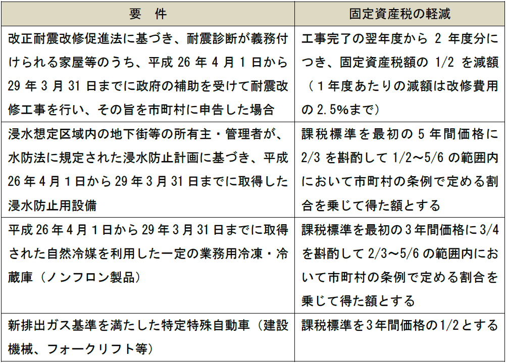 改正耐震改修促進法に基づき耐震診断結果の報告を平成27年3月31日までに行った事業者が、平成26年4月1日からその報告後5年の間に、耐震改修対象建築物の耐震改修により取得し、また建設した耐震改修対象建築物の部分について、取得価額の25%の特別償却ができる。