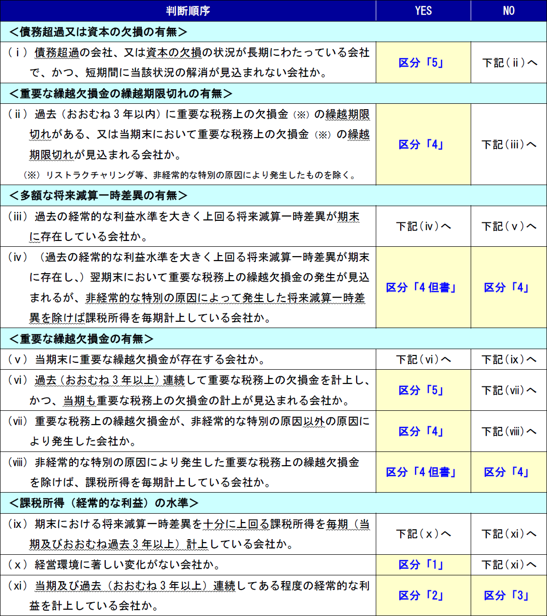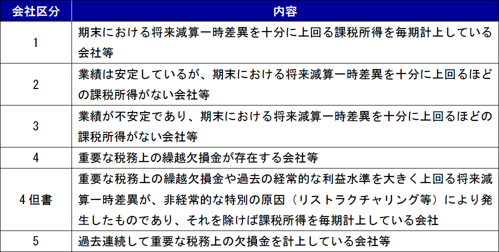 そのため、繰延税金資産の回収可能性の検討では、まず会社区分を決定する。