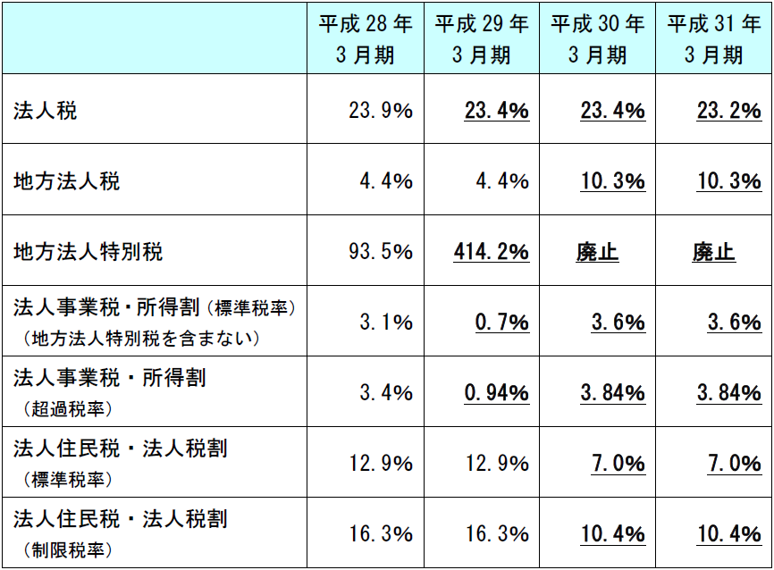 - 平成28年3月31日に国会で改正法人税法等及び改正地方税法等が改正された。なお、ここでは、地方法人特別税の廃止された分、法人事業税・所得割の税率を引き上げている。