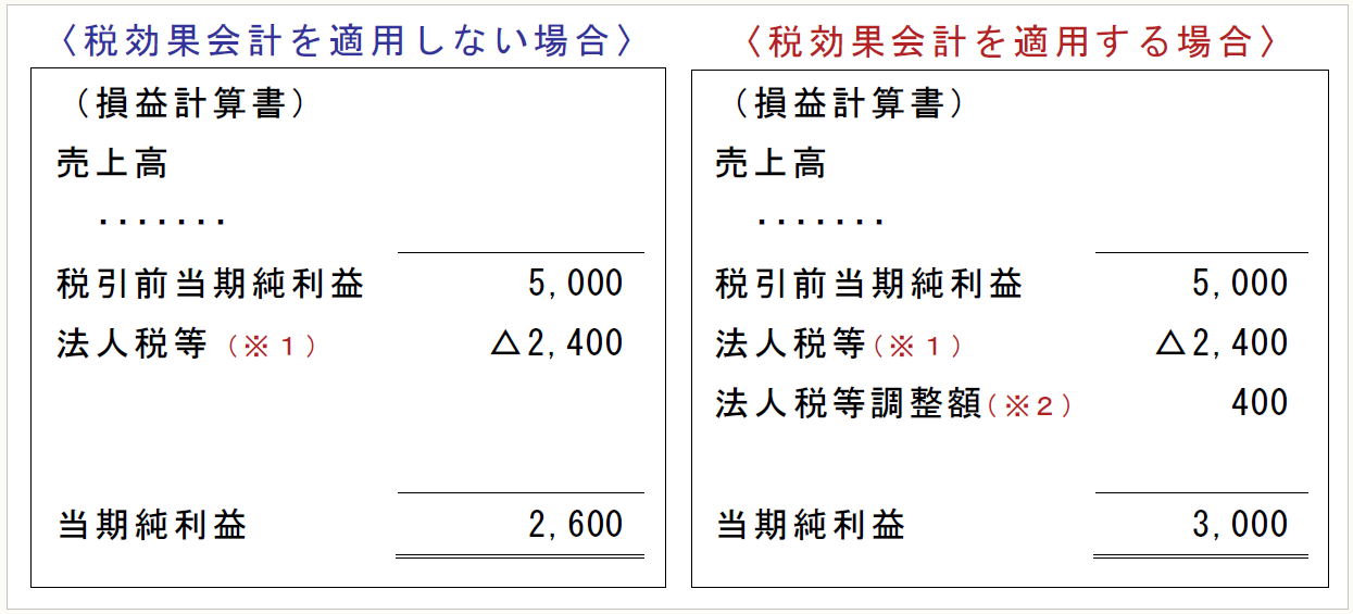 このため、税効果会計を適用しない場合には、課税所得を基礎とした法人税等の額が費用として計上され、法人税等を控除する前の企業会計上の利益と課税所得とに差異があるときは、法人税等の額が法人税等を控除する前の当期純利益と期間的に対応せず、また、将来の法人税等の支払額に対する影響が表示されないことになる(「税効果会計に係る会計基準の設定に関する意見書」(以下「税効果会計意見書」という)二、1。1998年10月30日、企業会計審議会)。そこで、このような相違を適切に調整する方法が必要とされ、「税効果会計に係る会計基準」が設定された。