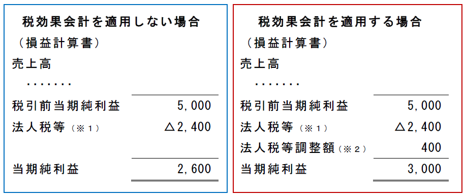 損益計算書については前述のとおりであるが、貸借対照表においては税効果会計の適用により、基本的に、繰延税金資産及び繰延税金負債が計上されることになる。
