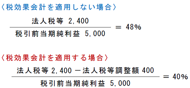 税効果会計を適用する場合には、法人税等を控除する前の当期純利益と法人税等の比率は40%となる。これは法定実効税率40%と一致しているので、合理的な対応が図られていると考えられる。