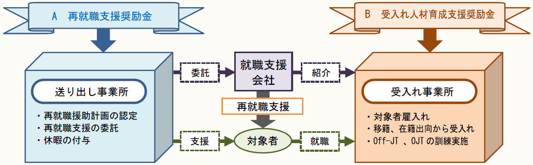 この助成金は、事業縮小に伴い離職に至る労働者の再就職支援や労働者を受け入れた事業主を助成することで、早期再就職の実現を目的とするもので、次のA・Bの2種類がある。