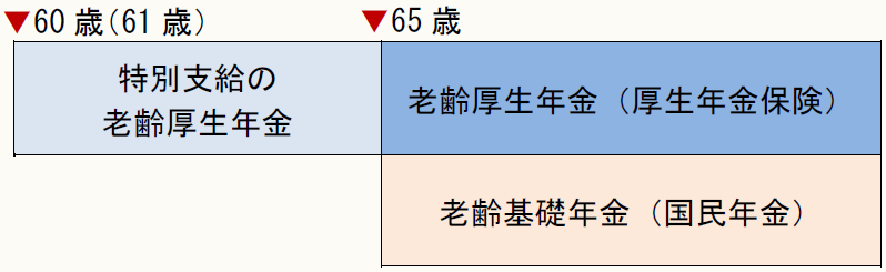 なお、現在、厚生年金保険は、生年月日により60歳(男性の場合は61歳)から「特別支給の老齢厚生年金」として支給されている。
